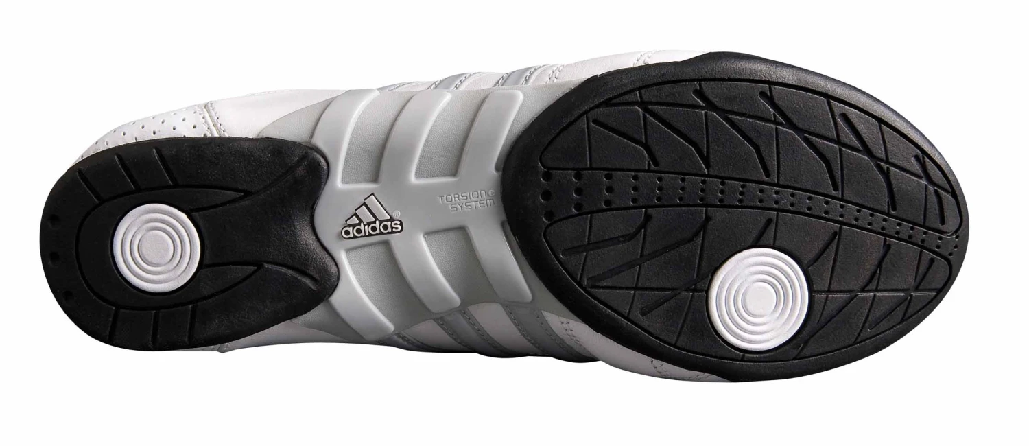 These Adidas shoes have a laceless design for easy on/easy off. Soft leather construction with a padded tongue for added comfort. Firm plastic arch support with Adidas stripes. Sole includes 2 pivot points for increased mobility when turning.